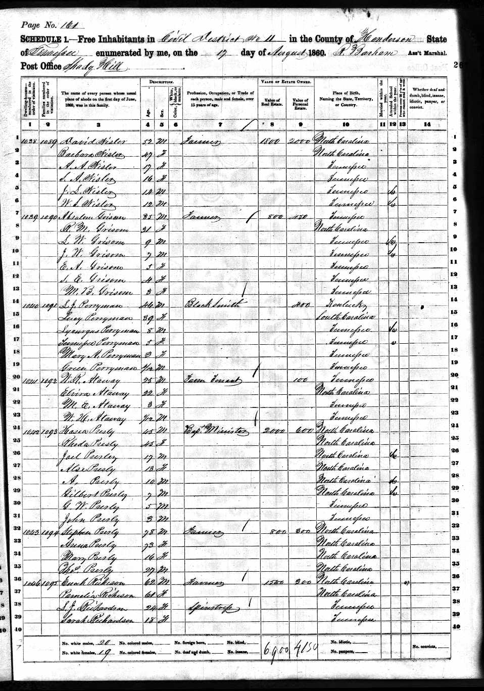 1860 Absolum and Margarett had 5 children. Leander William 9, James Wilson 7, Elizabeth Ann 5, Sarah Elizabeth 4 and Martha Branch 3.