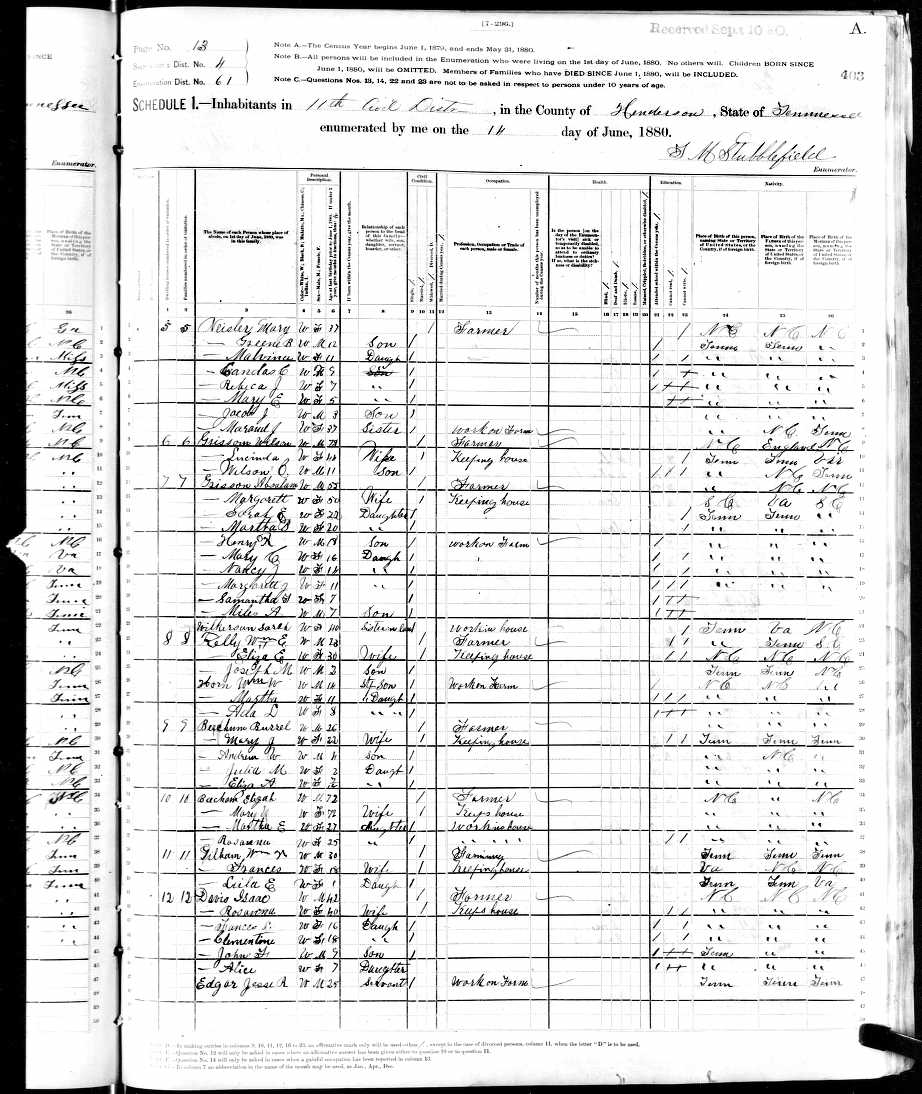 In the 1900 census Margarett is a widow because Absolum died in 1889. Nancy Jane Williams has moved back home with her daugher Lilly who is 7. I believe their last name should be Williams. Margarett still has 3 children in the household. Elizabeth, Martha and Miles one of the twins.