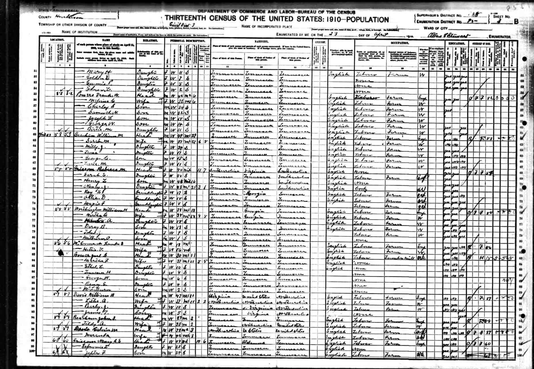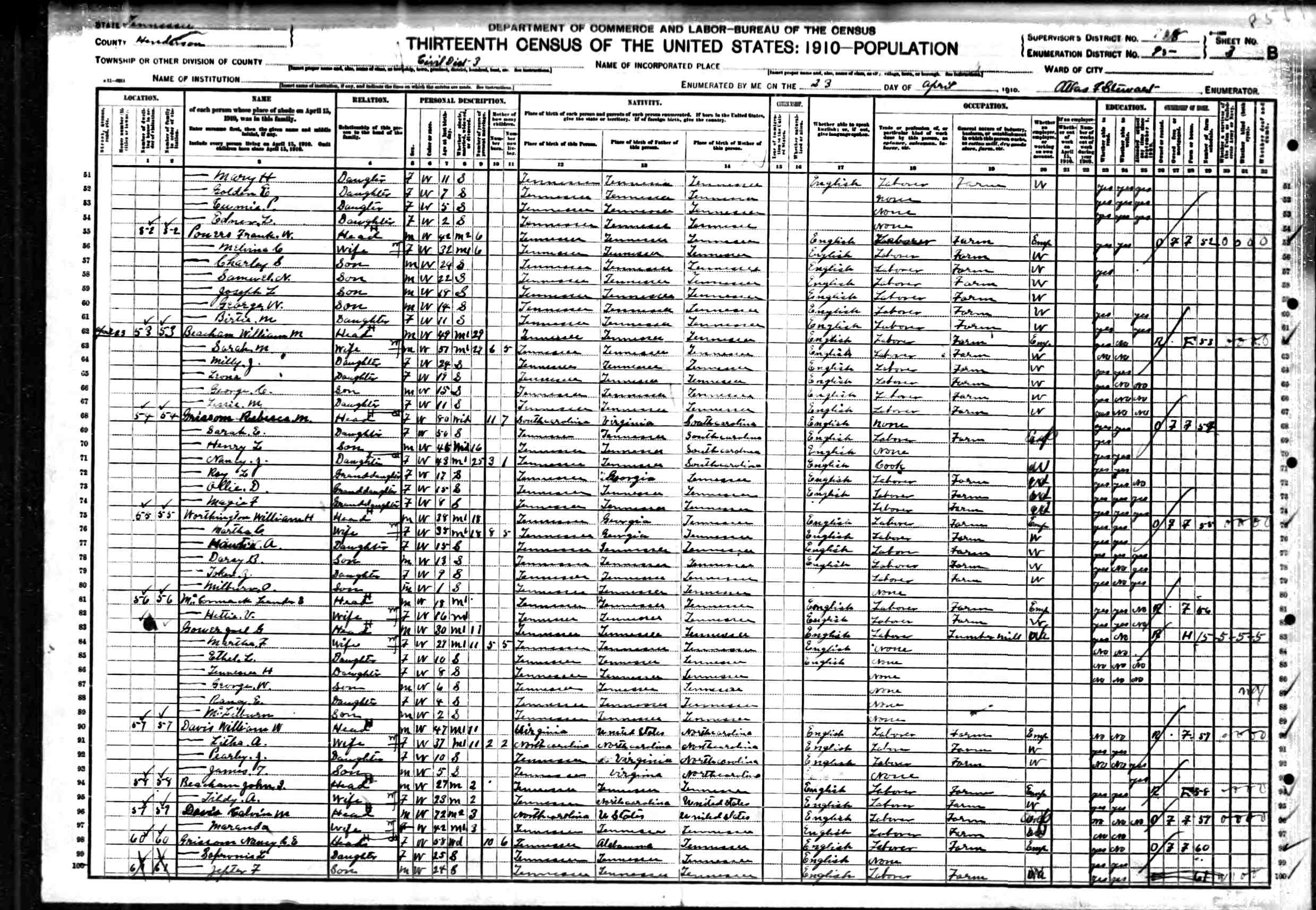 1910 Census shows that a few of her and Absolum's children have moved back home. Nancy Jane and Henry Linden/leonard. Sarah Elizabeth is now 56 and single. Henry works as a cook. Nancy Jane has 3 children.